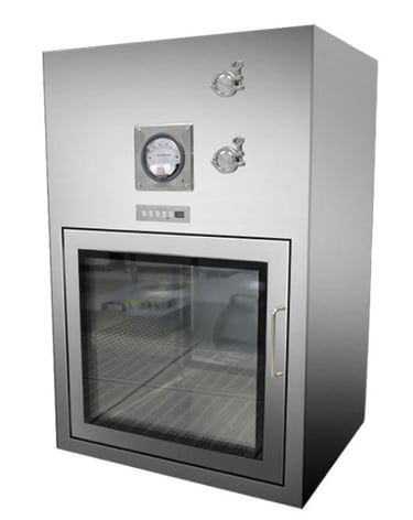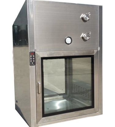 SUPPORT STAND FOR WALL MOUNTED DYNAMIC PASS BOX, U.V.LIGHT AND U.V.HOUR METER HEPA CHOKING ALARM (AUDIBLE & VISIBLE) BLOWER TRIPPING ALARM(AUDIBLE & VISIBLE) L TYPE /3 WAY DOOR ARRANGMENT FLAME PROOF FITTING FEATHER TOUCH SWITCHES, SS PERFORATED PROTECTIVE GRILL FOR HEPA FILTER.