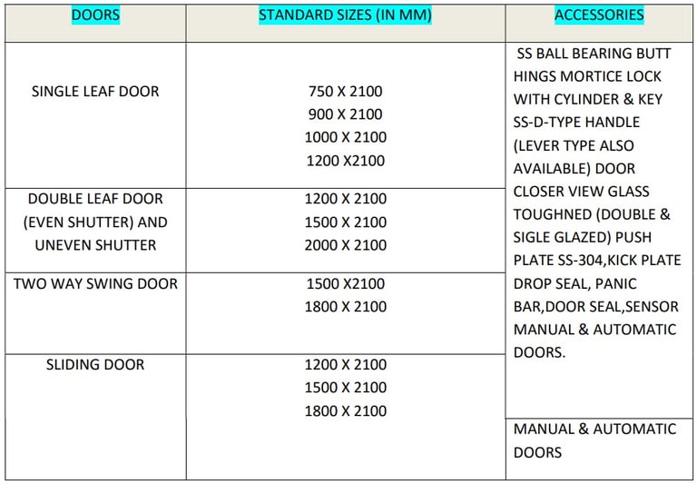 Easy to operate and flushed construction, Strong stable and Compact Door. Wide Range and Materials of construction-Powder Coated/Stainless steel. Designed to meet stringent requirement of clean room and Healthcare. Wide range of indigenous accessories and finish powder coated/PU painted. High Density pre insulated puff/Honey comb as infill materials. Aesthetically pleasing to suite the Architectural requirement smooth and seamless for easy cleaning, stringent quality checks to ensure accuracy and reliability. Sizes and specification can be customized as per the requirements Door can be manual or sensor operated, Suitable to fix in civil walls and Modular Partitions Assist in improving working ambiance and workmen efficiency.